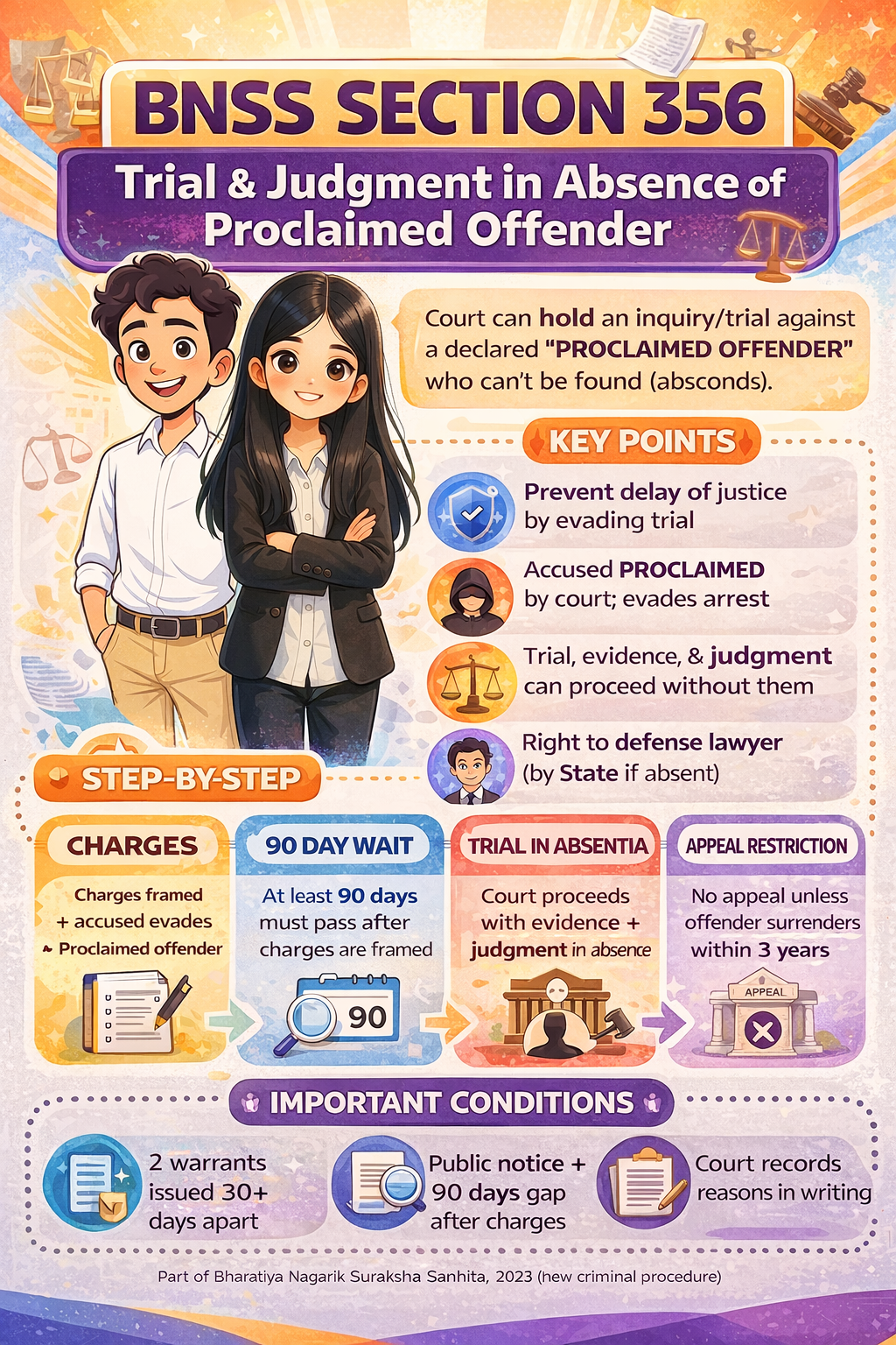Section 356 of BNSS deals with “Inquiry, Trial, or Judgment in Absence (in Absentia) of a Proclaimed Offender.”